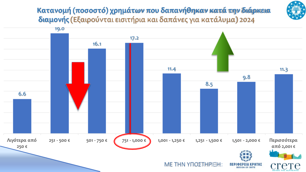 Η μέση δαπάνη των επισκεπτών αυξήθηκε κατά 8%, ανατρέποντας την περυσινή πτωτική τάση. Οι μεγαλύτερες αυξήσεις καταγράφηκαν στη δαπάνη για εστίαση (+7%) και τοπικά προϊόντα (+3%), ενώ σταθερές παρέμειναν οι δαπάνες για διαμονή και μεταφορές. Οι τουρίστες από ΗΠΑ/Καναδά/Αυστραλία σημείωσαν τη μεγαλύτερη αύξηση δαπανών, ειδικά στην εστίαση και τις αγορές τοπικών προϊόντων.