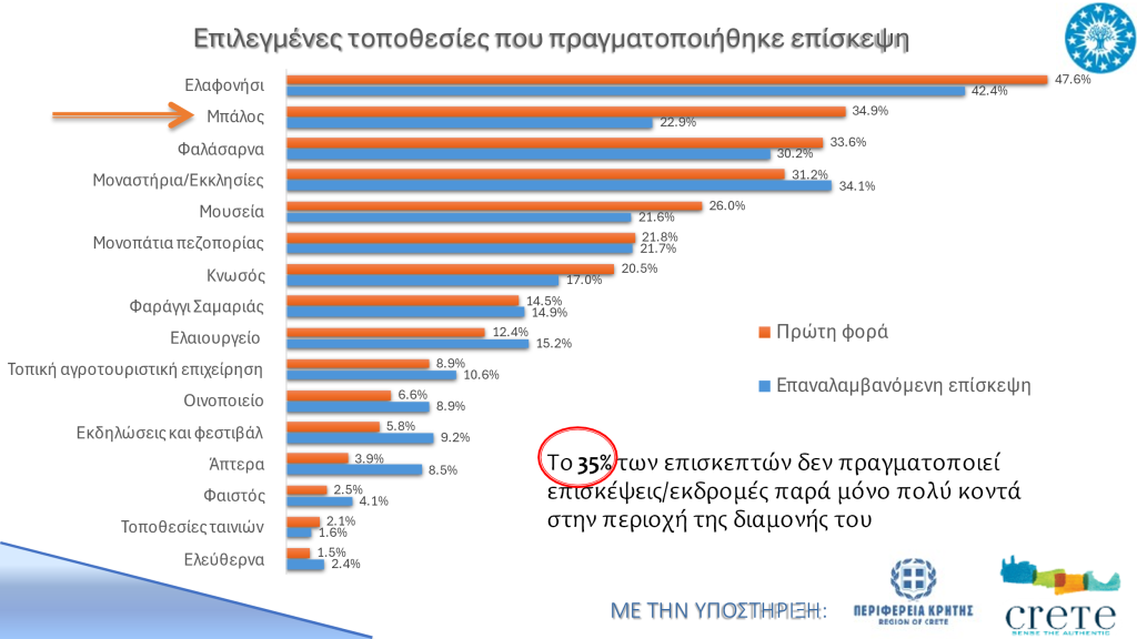 Παρατηρείται ότι και οι τρεις εμβληματικές παραλίες του Νομού Χανίων, όπως είναι του Ελαφονησίου, του Μπάλου και των Φαλασάρνων είναι στις πρώτες επιλογές των αλλοδαπών τουριστών αλλά κρίνεται απαραίτητη η αειφορική διαχείριση των προορισμών αυτών, δεδομένου όχι μόνο του πολύ μεγάλου αριθμού αφίξεων αλλοδαπών τουριστών αλλά και των μειώσεων των επαναλαμβανόμενων επισκέψεων, ειδικά στην παραλία του Μπάλου, που ίσως να κρύβεται μια απογοήτευση από την προηγούμενη τους επίσκεψη. Αξίζει να σημειωθεί επίσης, ότι το 35% των επισκεπτών δεν πραγματοποιεί επισκέψεις/εκδρομές παρά μόνο πολύ κοντά στην περιοχή διαμονής του, όταν το αντίστοιχο ποσοστό πέρυσι ήταν 31% και πρόπερσι 24%.