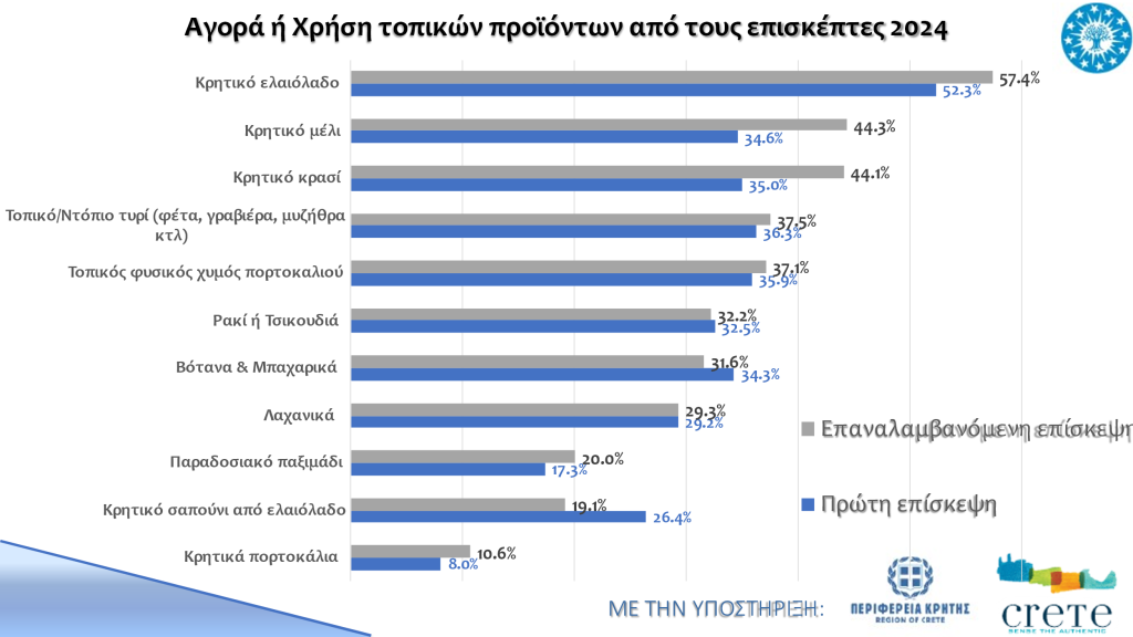 Η προτίμηση στα τοπικά αγροτικά προϊόντα παραμένει υψηλή, με το 60% όσων έχουν ξαναεπισκεφθεί τη Δυτική Κρήτη να αγοράζουν περισσότερα προϊόντα σε σχέση με νέους επισκέπτες. Τα πιο δημοφιλή προϊόντα παραμένουν το ελαιόλαδο, το μέλι, το κρασί και τα τοπικά τυριά.