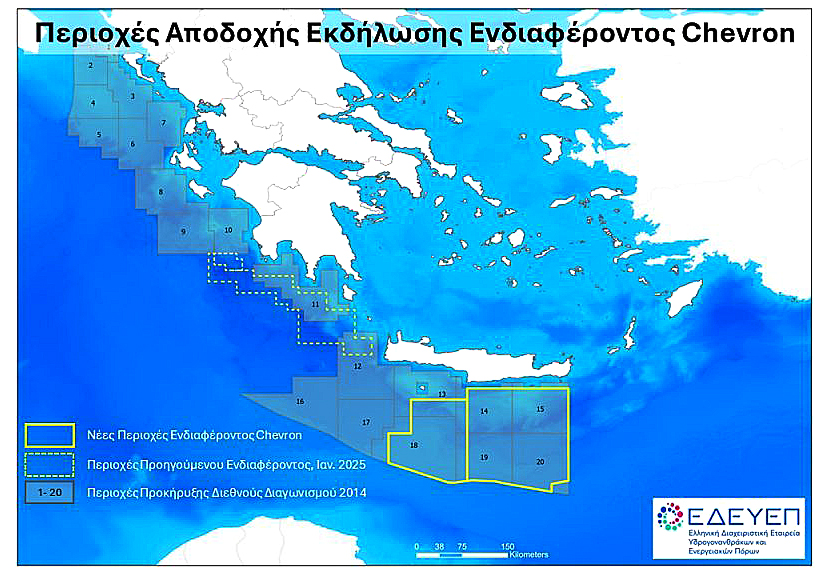 Το Υπουργείο Περιβάλλοντος και Ενέργειας αποδέχεται την εκδήλωση ενδιαφέροντος της Chevron για τις περιοχές Νότια Κρήτη Ι και Νότια Κρήτη ΙΙ. Η ηγεσία του Υπουργείου θα προχωρήσει άμεσα στην έκδοση σχετικής απόφασης αποδοχής του ενδιαφέροντος, καθώς και αποφάσεων που θα προσδιορίζουν τις ακριβείς συντεταγμένες της περιοχής, τον τύπο της σύμβασης και την προκήρυξη διεθνούς διαγωνισμού. Σημειώνεται ότι οι νέες περιοχές ενδιαφέροντος διαθέτουν ήδη εγκεκριμένη Στρατηγική Μελέτη Περιβαλλοντικών Επιπτώσεων.