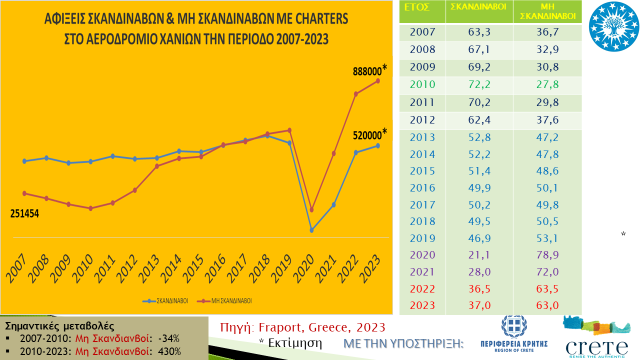 Η φετινή αύξηση, σε σχέση με το 2022, οφείλεται τόσο από τους Σκανδιναβούς όσο και από τους μη Σκανδιναβούς, οι οποίοι σημειώνουν ισόποσο ποσοστό αύξησης. Ειδικότερα από τους Σκανδιναβούς, τη μεγαλύτερη αύξηση σημειώνουν οι Νορβηγοί με 30% και ακολουθούν Σουηδοί και Φινλανδοί με ποσοστά αύξησης 8% και 6%, αντίστοιχα. Αντίθετα, μείωση καταγράφουν οι Δανοί κατά 5%, παραμένοντας όμως στη δεύτερη θέση επί των συνολικών αφίξεων. Γενικά, παρατηρούμε ότι οι Σκανδιναβοί σταθεροποιούνται κοντά στο 37% επί των συνολικών αφίξεων μετά την εποχή του κορονοϊού, όταν πριν το ποσοστό τους είχε εδραιωθεί γύρω στο 50%. Το γεγονός αυτό δεν σημαίνει ότι οι αφίξεις των Σκανδιναβών μειώνονται, αλλά ότι οι αφίξεις των μη Σκανδιναβών αυξάνονται με πολύ πιο γοργούς ρυθμούς.