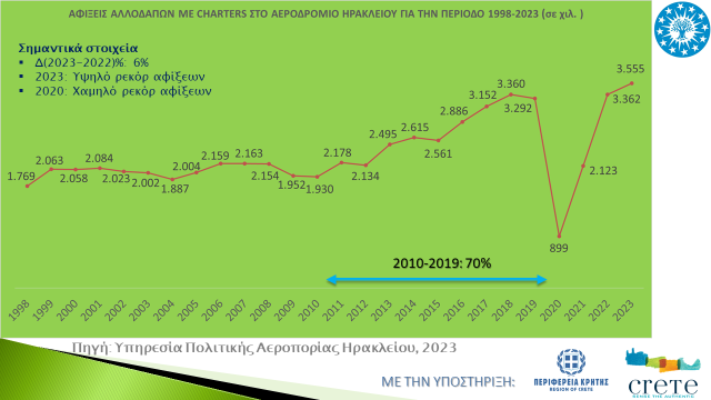 Αναφορικά με τις αφίξεις αλλοδαπών τουριστών στο αεροδρόμιο Ηρακλείου και με βάση τα πρόσφατα στοιχεία της Υπηρεσίας Πολιτικής Αεροπορίας Ηρακλείου, για το έτος 2023, καταγράφεται πολύ υψηλός αριθμός αφίξεων, της τάξεως των 3,6 εκατ. αφίξεων, σημειώνοντας αύξηση κατά 6% σε σχέση με το προηγούμενο έτος.
