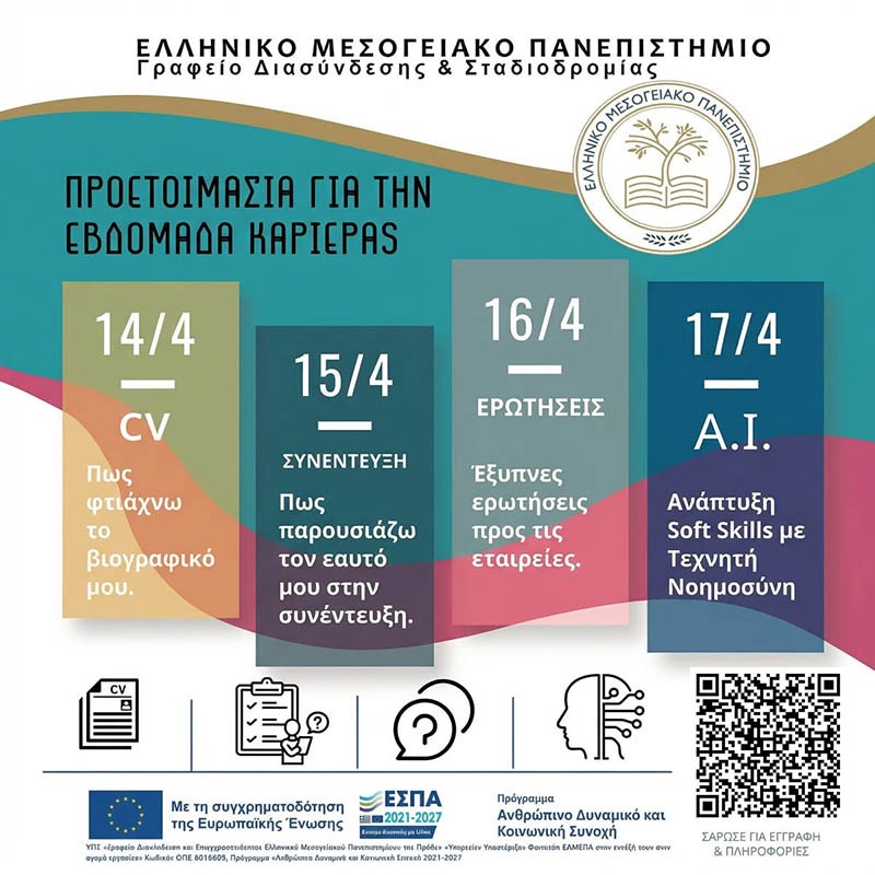 Το Γραφείο Διασύνδεσης και Σταδιοδρομίας του Ελληνικού Μεσογειακού Πανεπιστημίου (ΕΛΜΕΠΑ), σε συνεργασία με τα Ακαδημαϊκά Τμήματα και τις Σχολές του Ιδρύματος, προσκαλεί φοιτητές, φοιτήτριες και αποφοίτους στην Εβδομάδα Καριέρας ΕΛΜΕΠΑ 2026, μια σημαντική πρωτοβουλία που έχει στόχο να φέρει σε άμεση επαφή τη νέα γενιά επιστημόνων με επιχειρήσεις και οργανισμούς που δραστηριοποιούνται στους αντίστοιχους επαγγελματικούς κλάδους.