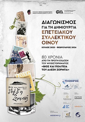 Ο διαγωνισμός του επετειακού συλλεκτικού οίνου Μουσείου Νίκου Καζαντζάκη, διοργανώνεται το Σάββατο 24 Ιανουαρίου 2026, ώρα 12:30 και εκτιμάται ότι θα διαρκέσει από 2 έως 4 ώρες, στην αίθουσα «Γ. Ανεμογιάννης», στο Μουσείο Νίκου Καζαντζάκη, Μυρτιά Ηρακλείου, με είσοδο για το κοινό 80 ευρώ. Σημειώνεται ότι η εκδήλωση θα μεταδοθεί ζωντανά, μέσω livestreaming.