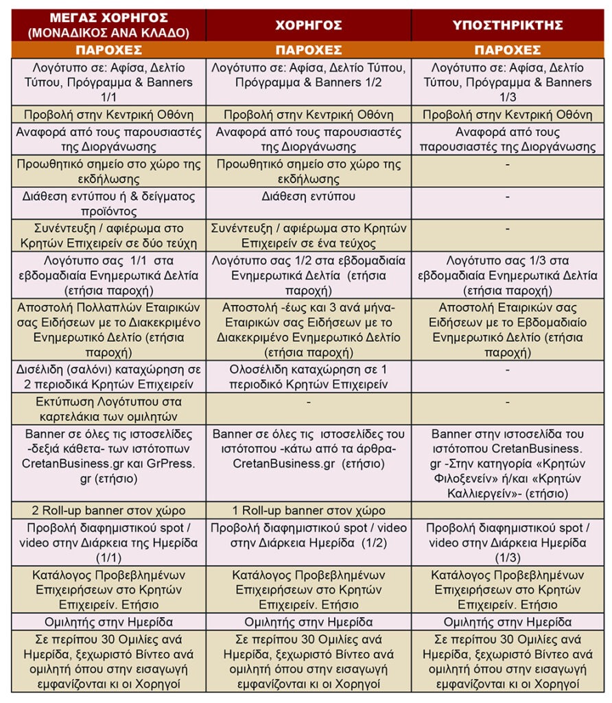 Παροχές ως Μέγας Χορηγός σε όλες τις δράσεις του Κρητών Επιχειρείν • Συνέντευξη / αφιέρωμα / αρθρογραφία στο Κρητών Επιχειρείν σε site και περιοδικά • Λογότυπο σας στα εβδομαδιαία Ενημερωτικά Δελτία • Αποστολή Εταιρικών σας Ειδήσεων με το Διακεκριμένο Ενημερωτικό Δελτίο • Δισέλιδη καταχώρηση (σαλόνι) στα 4 περιοδικά του Κρητών Επιχειρείν • Banner σε όλες τις ιστοσελίδες των ιστότοπων CretanBusiness.gr και GrPress.gr (Όλες οι παροχές είναι ετήσιες)