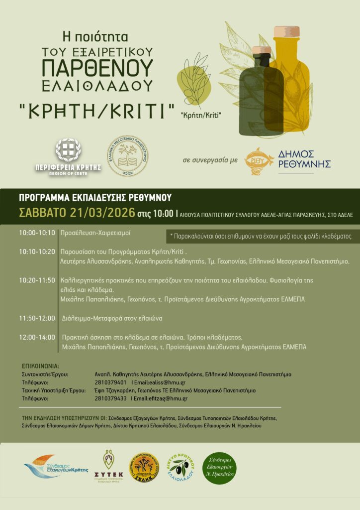 Ανοιχτή πρόσκληση προς τους ελαιοπαραγωγούς και κάθε ενδιαφερόμενο απευθύνουν η Περιφέρεια Κρήτης και το Ελληνικό Μεσογειακό Πανεπιστήμιο (ΕΛΜΕΠΑ), σε συνεργασία με τον Δήμο Ρεθύμνης, για τη συμμετοχή τους σε ενημερωτική και εκπαιδευτική ημερίδα. Στο επίκεντρο της δράσης βρίσκεται η αναβάθμιση της ποιότητας του Εξαιρετικού Παρθένου Ελαιόλαδου «Κρήτη / Kriti».
