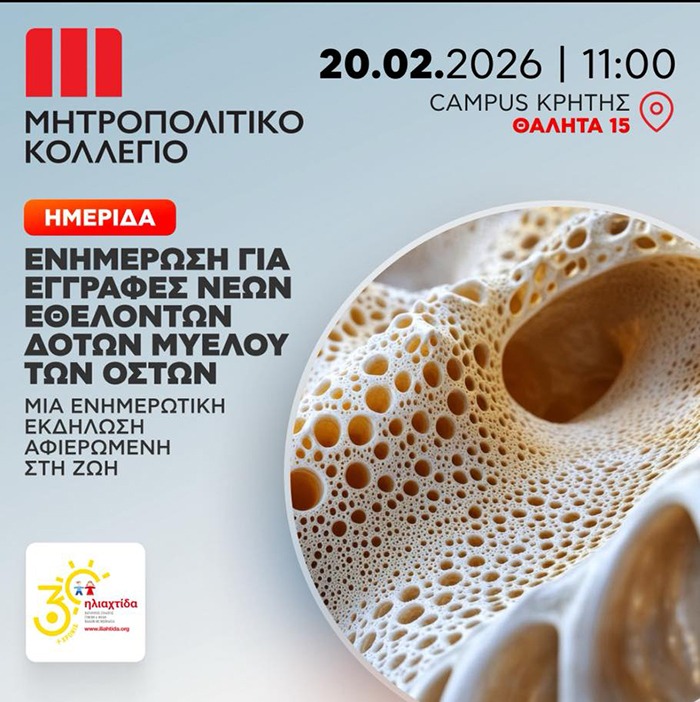 Στο πλαίσιο της συνεχούς προσφοράς και ευαισθητοποίησης, η Ηλιαχτίδα διοργανώνει την Παρασκευή 20 Φεβρουαρίου 2026, σε συνεργασία με το Μητροπολιτικό Κολλέγιο, δράση ενημέρωσης για τον μυελό των οστών και εγγραφή νέων εθελοντών–δοτών. Μια πρωτοβουλία που ενισχύει την κουλτούρα προσφοράς και μπορεί να χαρίσει ζωή σε συνανθρώπους μας.